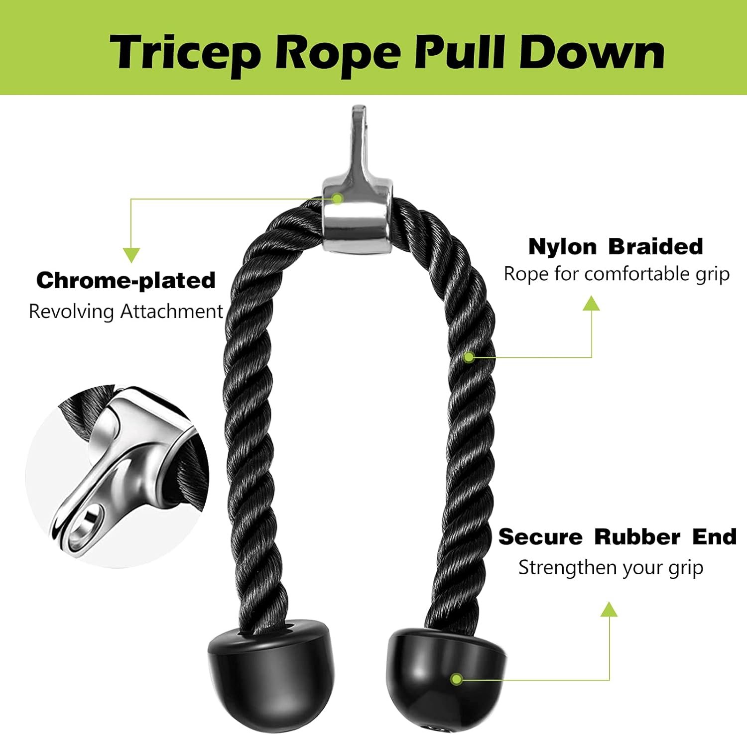 Durable Tricep Rope: Made from braided black nylon and featuring thick rubber end caps and a hard-chrome swivel, this rope allows fluid, secure movement during tricep extensions.