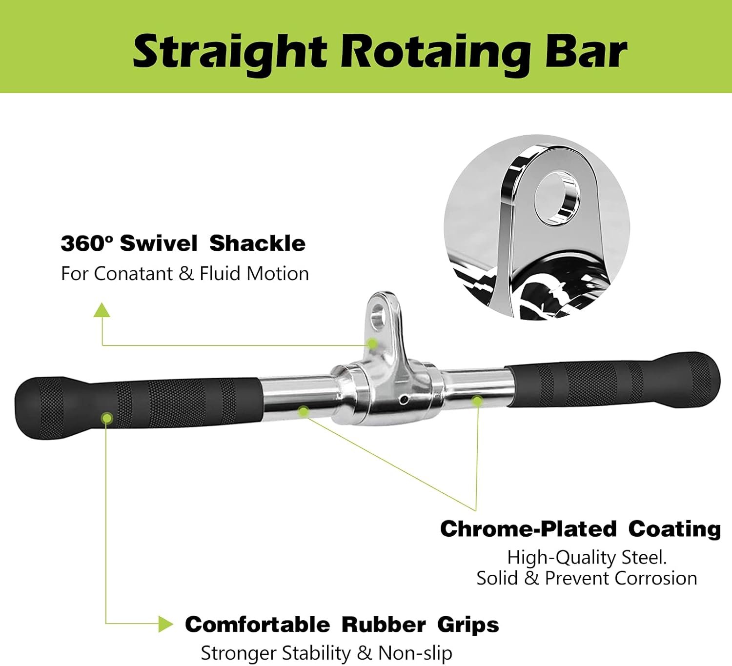Rotating Straight Bar: The straight bar is 18 inches long, with a 360-degree swivel to reduce joint strain, and textured rubber handles to keep your grip firm. The bar is also rated to support high weight.