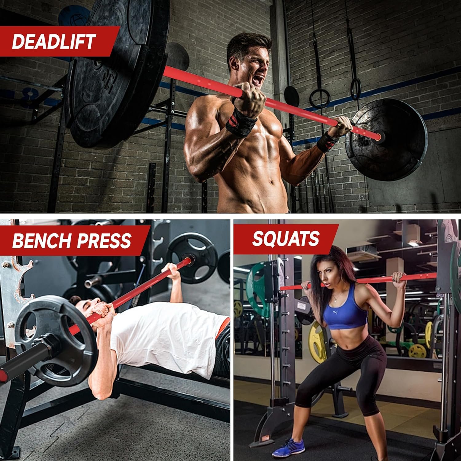 This Olympic barbell supports a wide range of compound movements commonly used in strength training and functional fitness routines, including: