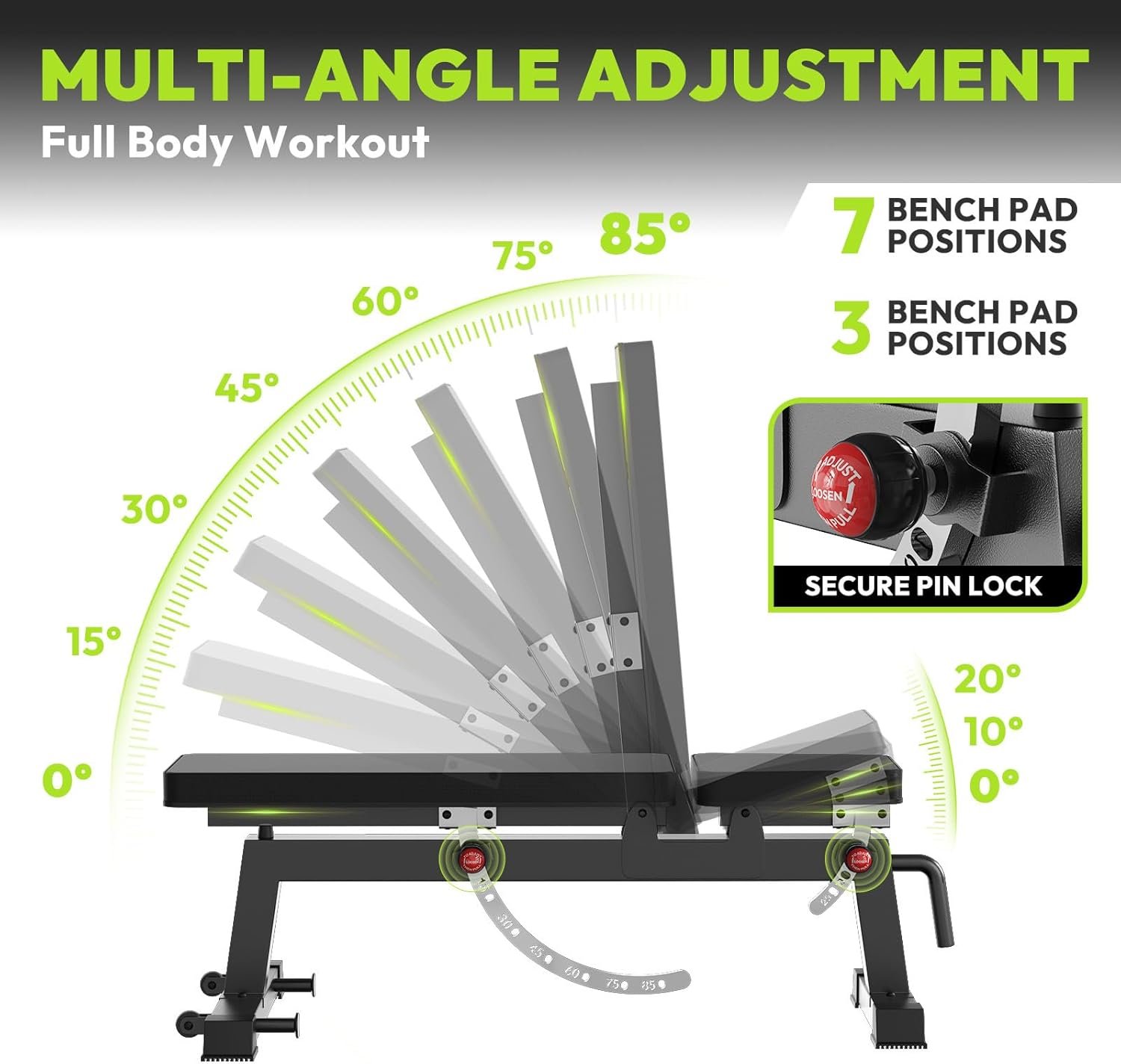 Adjustability: 21 total positions — including 7 backrest angles (0–85°) and 3 seat positions (0–20°) so you can perform flat, incline, upright presses, and core work.