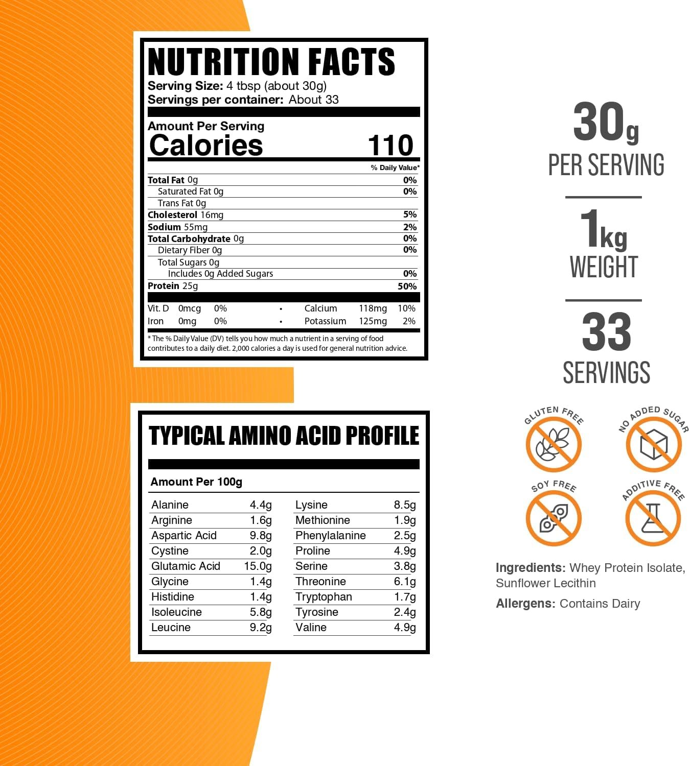 Pure Whey Protein Isolate: Typically provides ~26–30 g of protein per 30 g serving — a high level of protein with minimal fats and carbs.