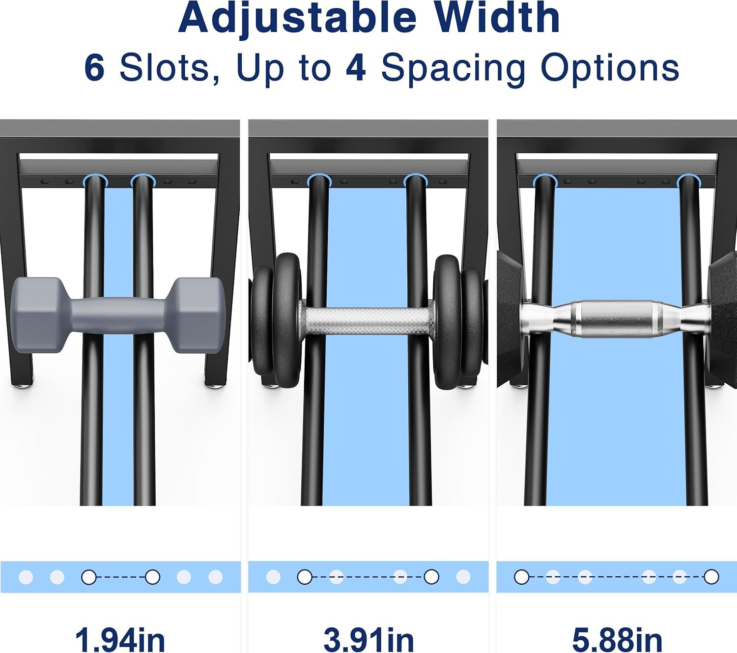 Three wide shelves hold various dumbbell sizes—hex, rubber-coated, neoprene, or adjustable dumbbells.