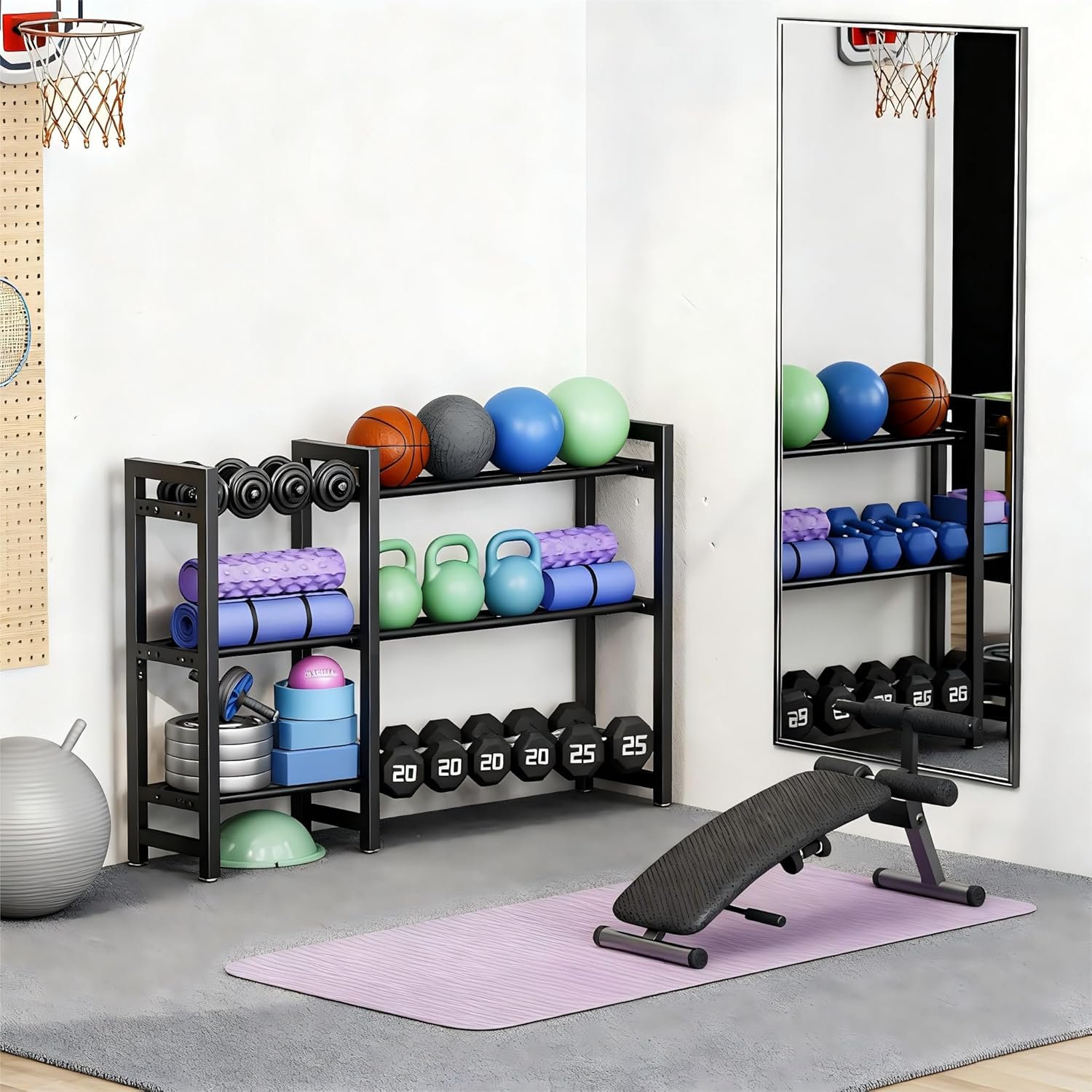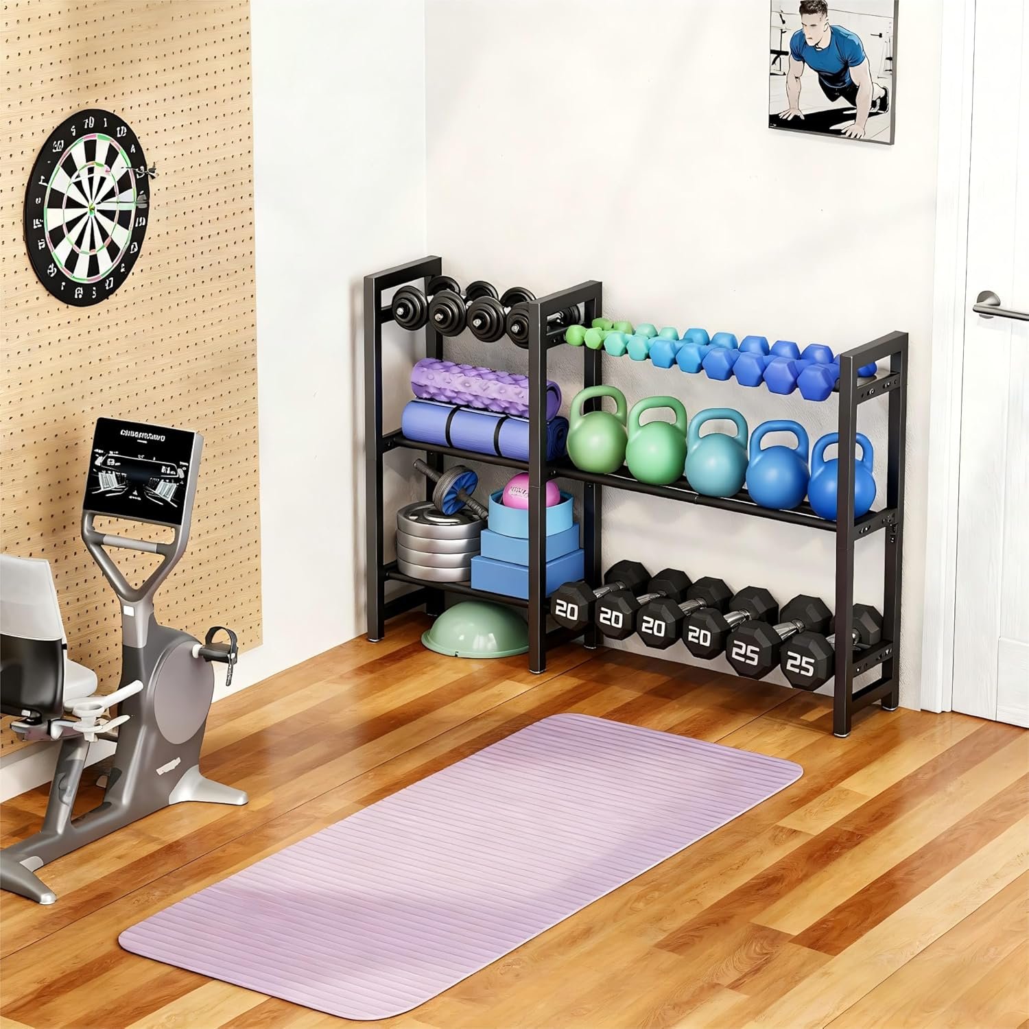 Fits easily into home gyms, garages, and small workout rooms while keeping equipment off the floor.