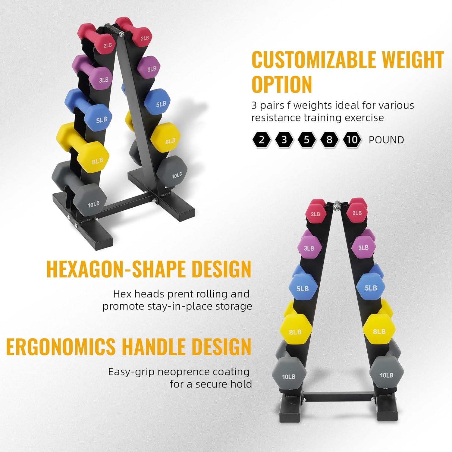 Compact and Convenient: The dumbbell set with rack is easily access and store dumbbells. These anti-rolling free weights are easy on the wrists and ideal for home gym, travel and outdoors