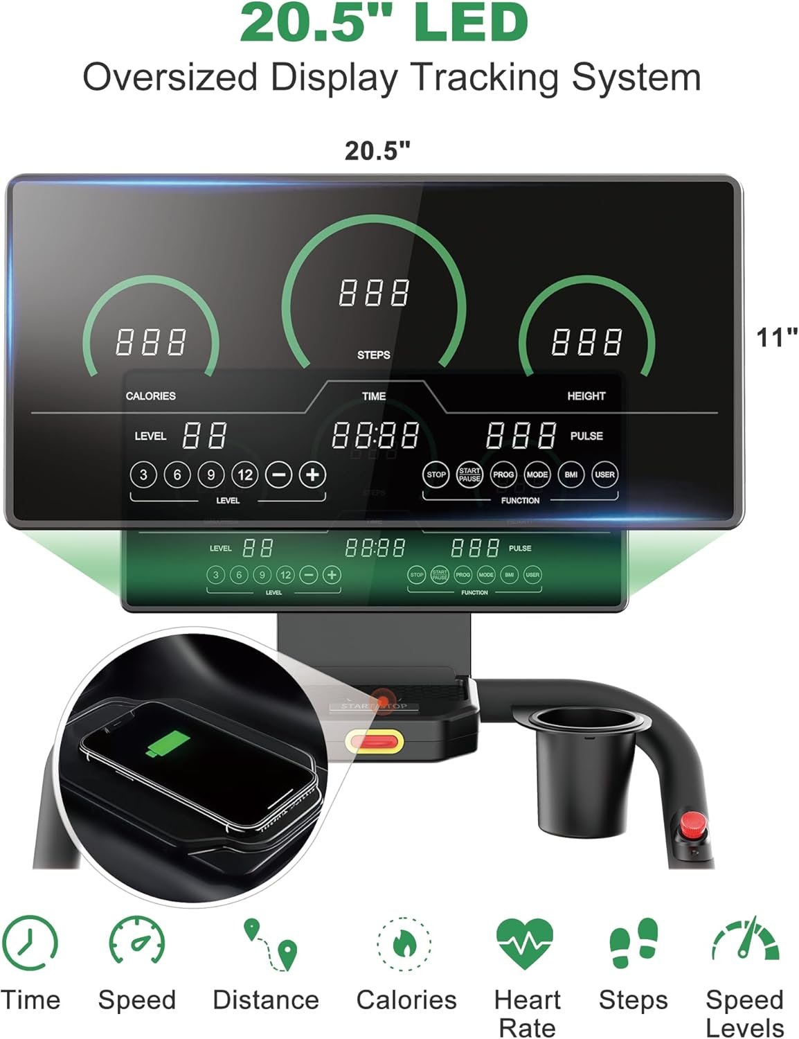 A 20.5″ bright LED screen puts your key metrics right in view, tracking your progress in real time. Typical data includes:
