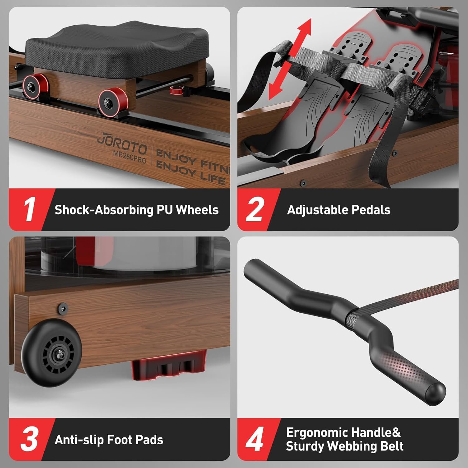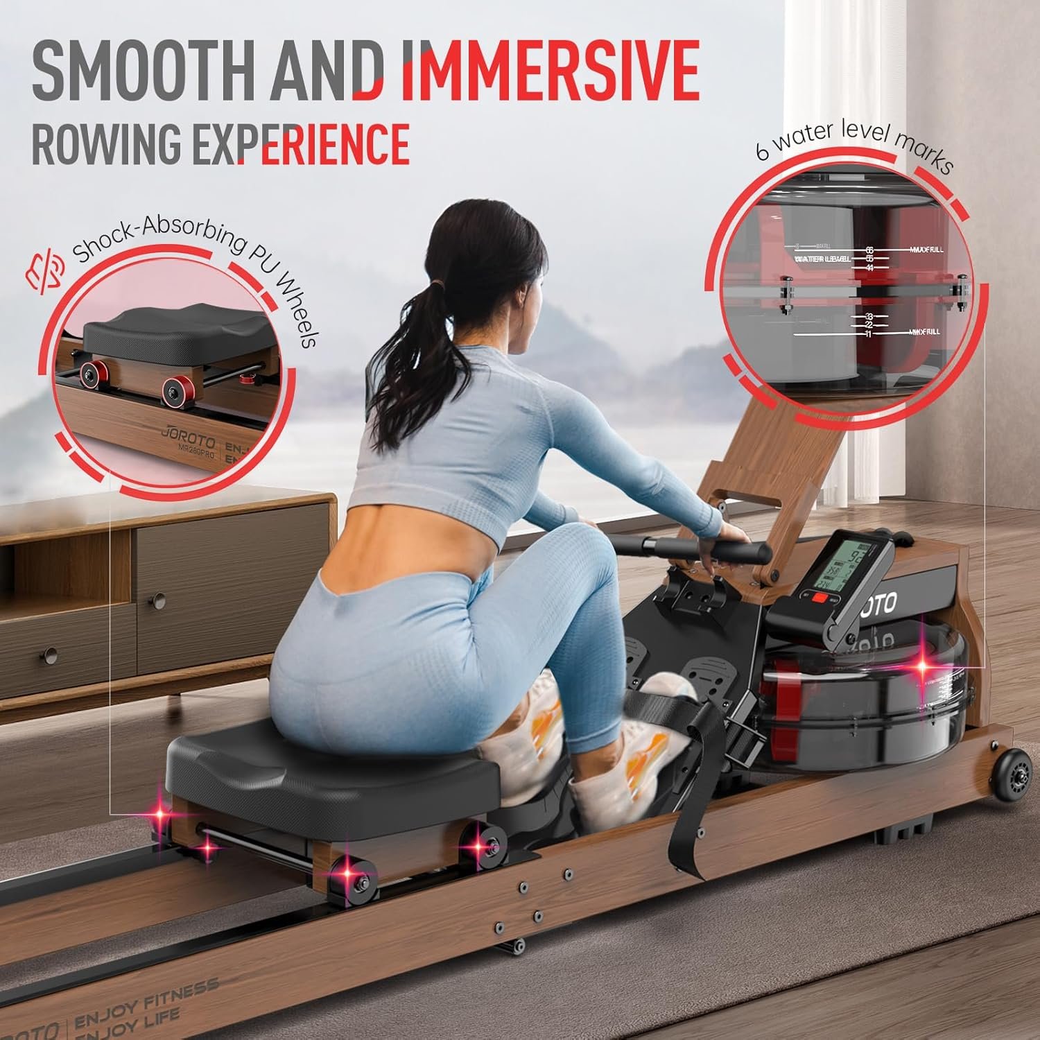 The JOROTO Water Rowing Machine (often seen in variants like the MR280PRO) is a water-resistance rowing machine designed for home gyms, delivering a smooth, immersive full-body workout that closely mimics rowing on real water. Instead of synthetic magnetic resistance, it uses real water paddles in a sealed tank to create natural drag — the harder and faster you pull, the greater the resistance you feel. This makes every session feel fluid and intuitive, ideal for cardiovascular endurance, strength building, and calorie burning from home.