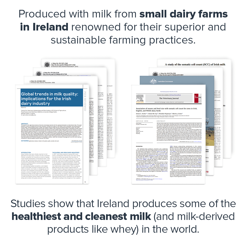 A gold standard of proof is Ireland’s non-GMO Truly Grass Fed™ certification—95% grass diet, 250 days on pasture, with actual inspectors verifying compliance. And that’s why Whey+ delivers what other “grass-fed” proteins only promise: guaranteed quality produced by ethical farming.