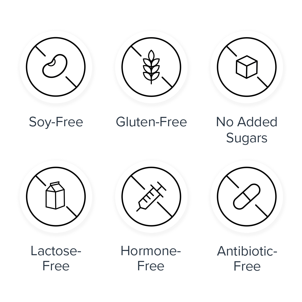 • Free of GMOs, rBST hormone additives, soy, gluten, artificial dyes, fillers — just clean fuel for your muscles.