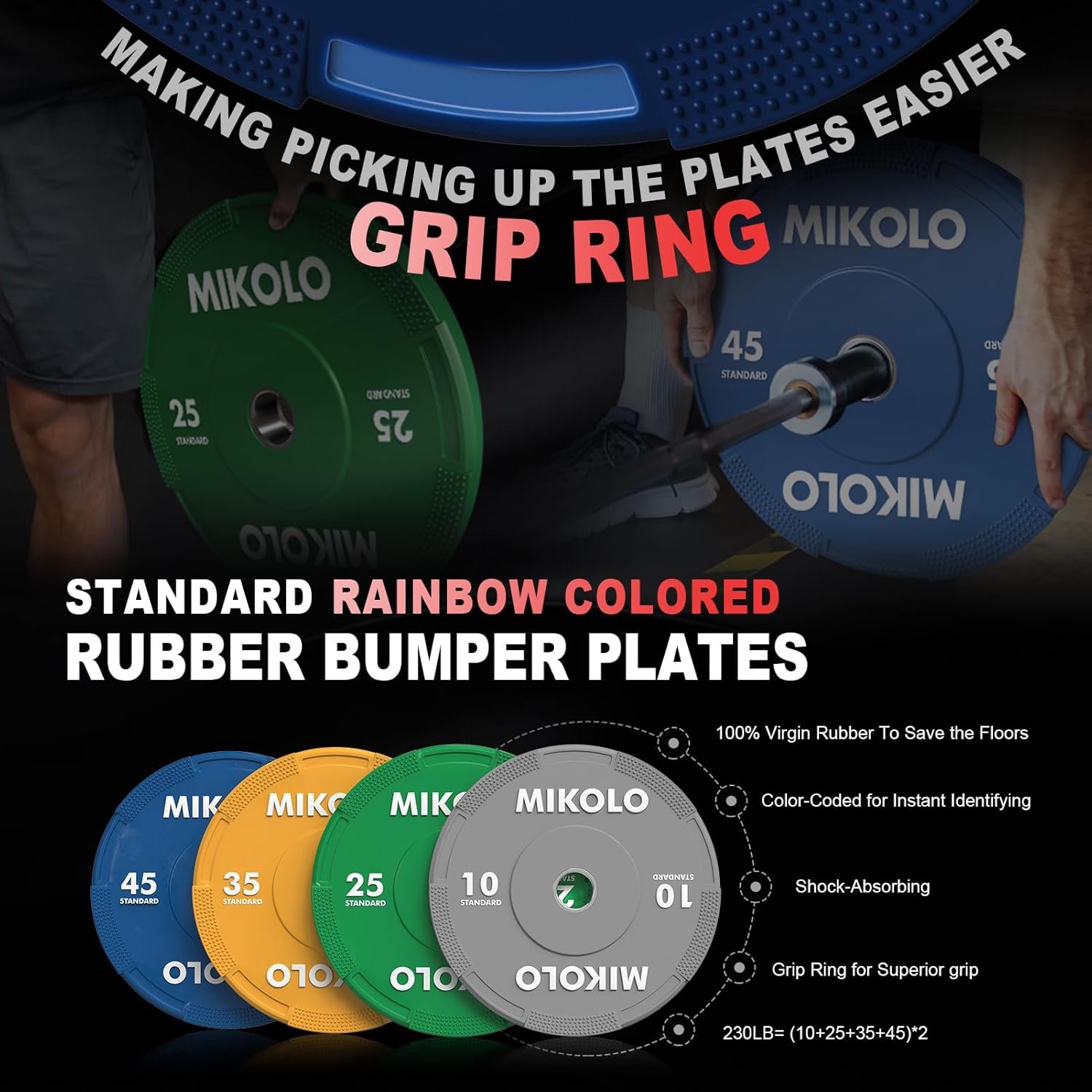 What’s in the package -Mikolo K6 Power Cage with Cable Crossover System *1; Adjustable Weight Bench *1; 7FT Olympic Barbell *1; 230LBS Olympic Bumper Plates Set (10lbs *2, 25lbs *2, 35lbs *2, 45lbs *2)