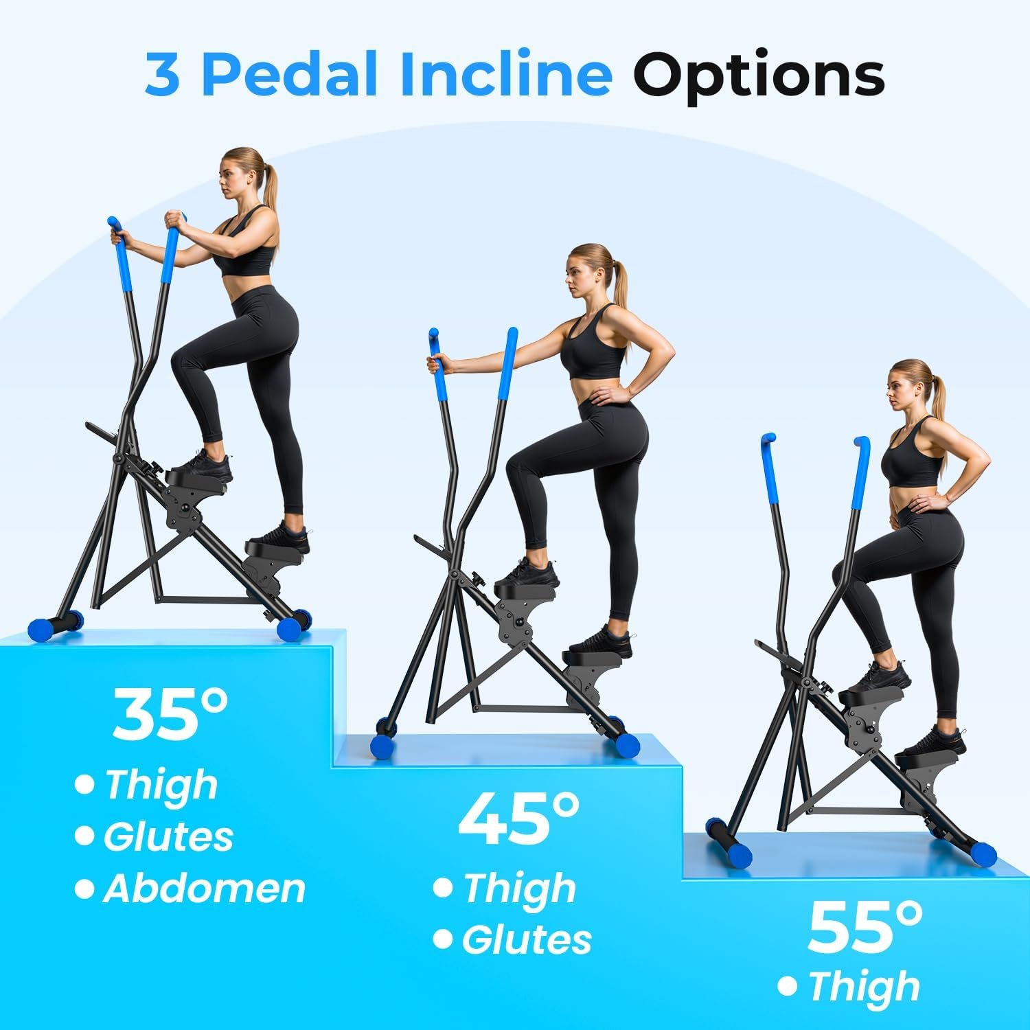 Large, textured pedals and full-length foam handles ensure a secure grip and stable footing during intense climbing sessions.