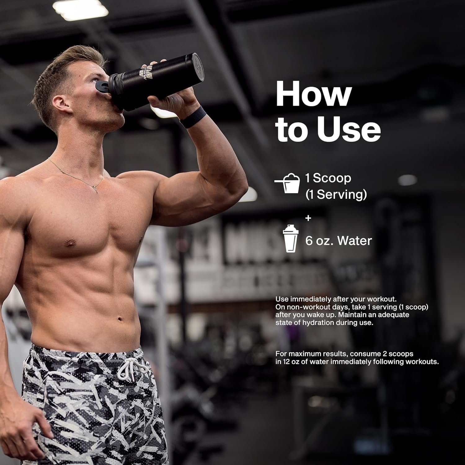 Daily Dose: Mix 5 g (1 scoop) with 8–12 oz of water or beverage of your choice — before or after workout is a popular timing.
