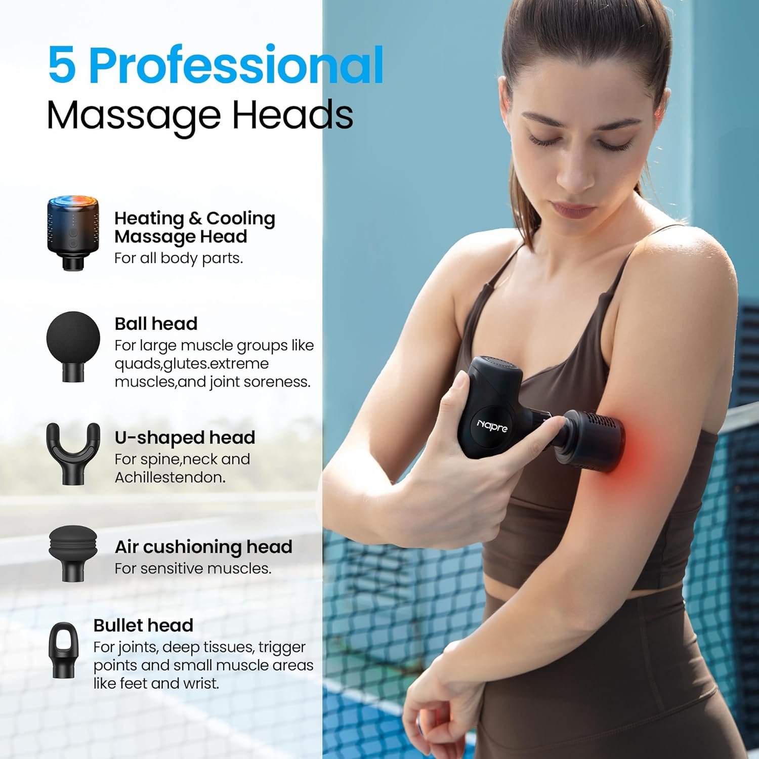 6 Specialized Massage Heads to target different muscle groups (ball, flat, U‑shaped, bullet, air‑cushion, etc.)