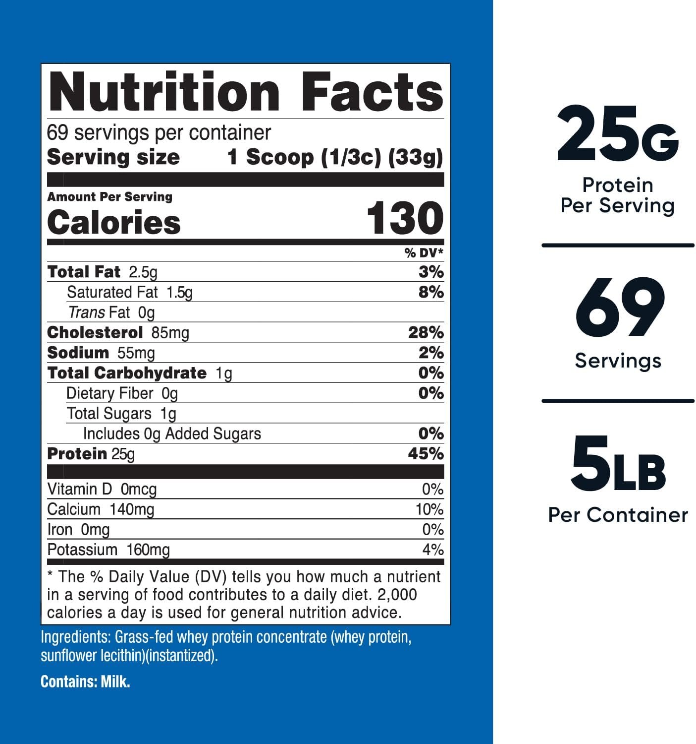 Primarily grass-fed whey protein concentrate (milk), plus lecithin and natural flavors/sweeteners in flavored versions.
