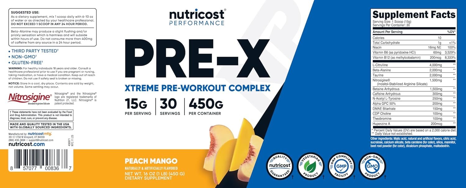 Get the power and endurance you need to crush your fitness goals with Nutricost Pre-X Xtreme Pre-Workout Complex – Peach Mango.