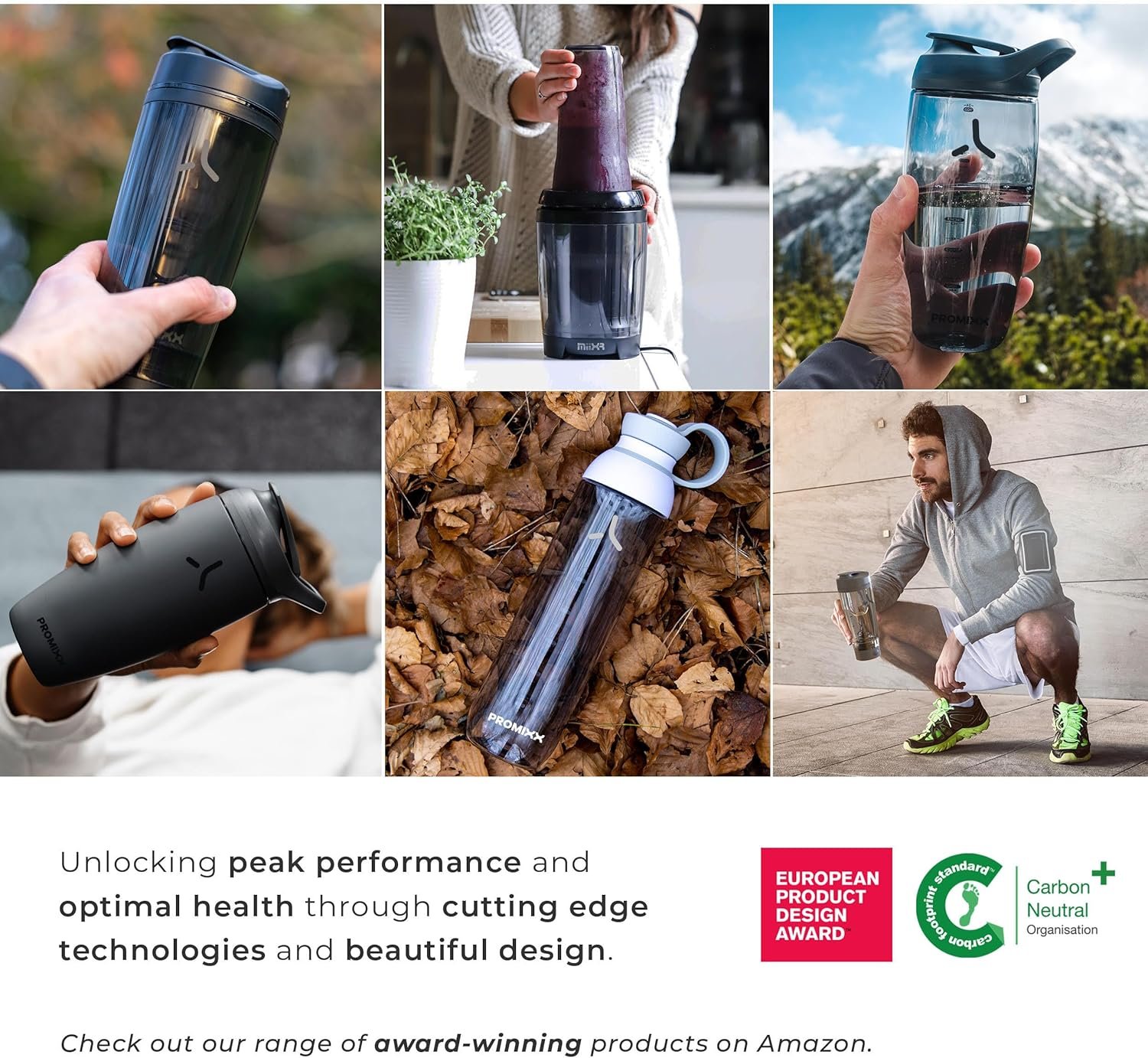 The PROMiXX PURSUIT Protein Shaker Bottle (24 oz) is a premium, eco‑friendly shaker engineered for athletes, gym‑goers, and health‑minded drinkers who want smooth, clump‑free shakes without noise or hassle. Built around PROMiXX’s distinctive snap‑fit agitator, this shaker delivers efficient mixing without a rattling metal ball, and its leak‑proof sports lid with carry loop makes it easy to take your drinks wherever you go. Made from durable plant‑based ECOZEN plastic, it’s BPA‑free, odor‑ and stain‑resistant — and designed to hold up to daily use.