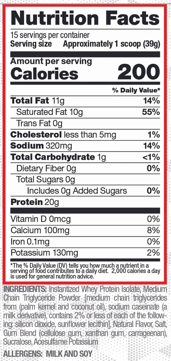- LOSE THE WEIGHT, NOT THE MUSCLE – This protein powder contains 20g of whey protein isolate, plus MCT fats. This combination will allow you to maintain muscle mass while shredding body fat.