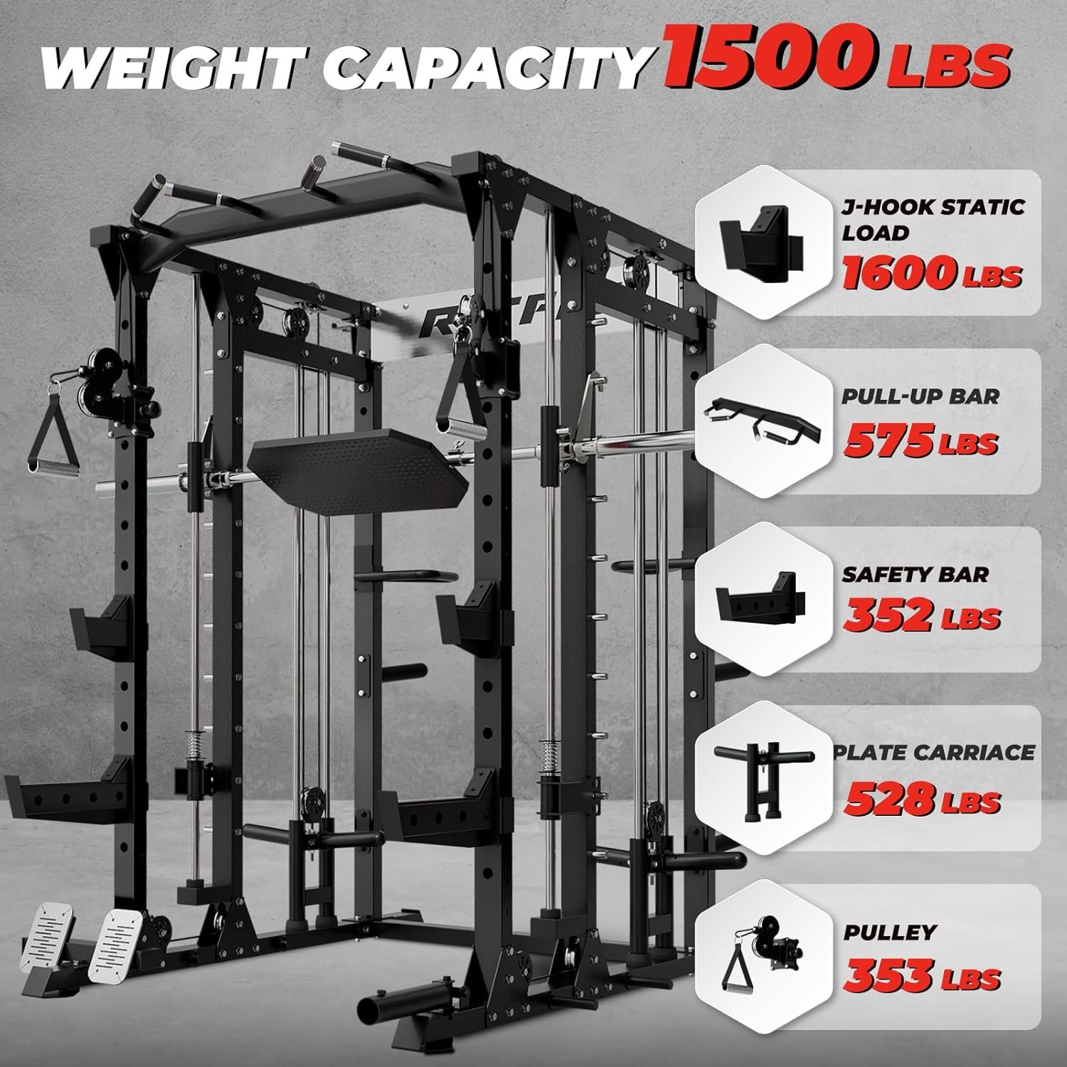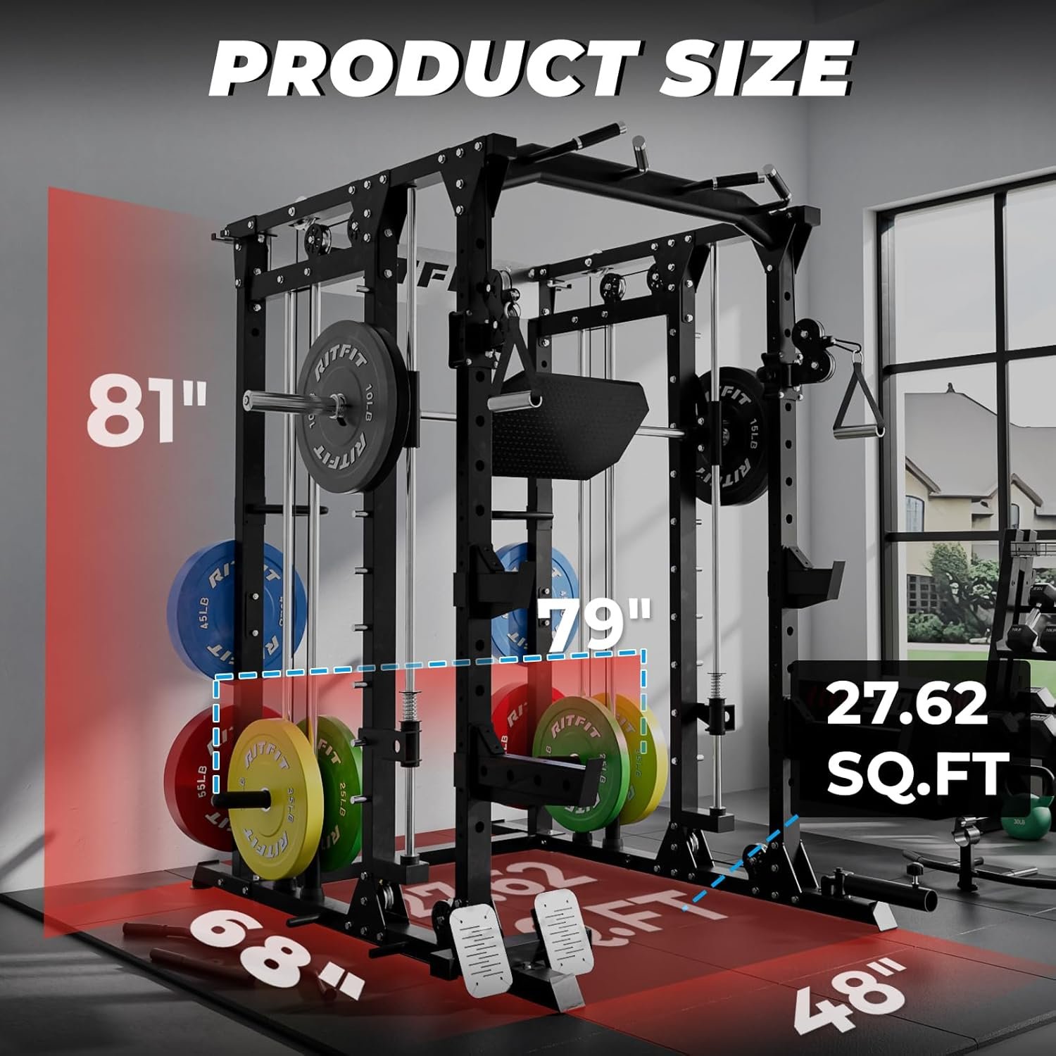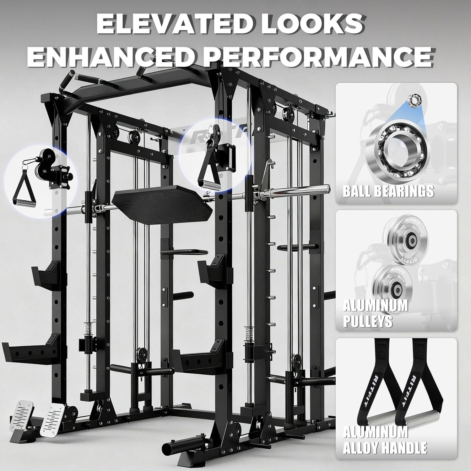 RitFit Smith Machine Power Cage with LAT Pulldown & Cable Crossover, All-in-One Power Rack Home Gym System