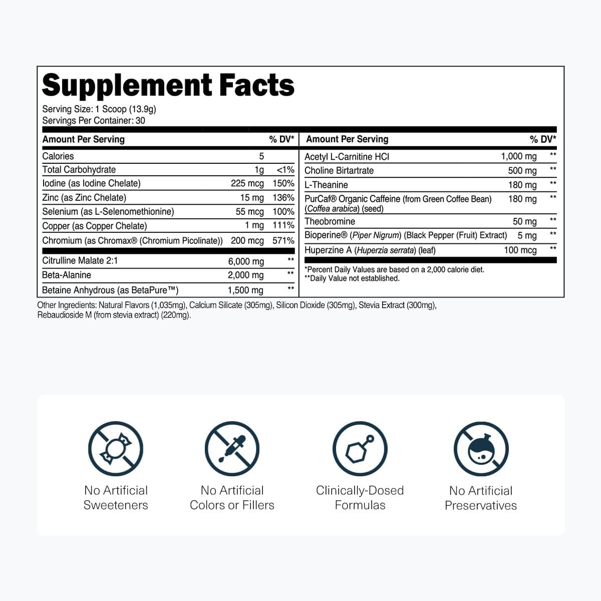 ✔ Enhanced Blood Flow & Pumps: High-dose L-Citrulline Malate (6,000 mg) boosts nitric oxide production to improve circulation, muscle pumps, and nutrient delivery during workouts.