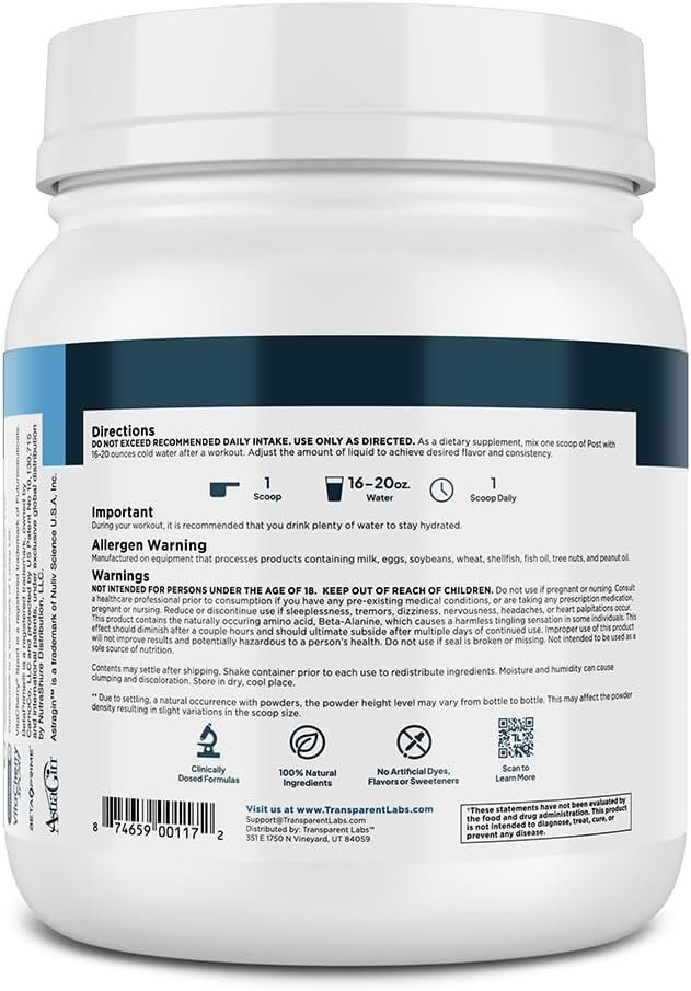 Transparent Labs Post-Workout is a premium recovery-focused supplement designed to help your body bounce back faster after training, reduce muscle soreness, and improve readiness for the next session. It combines clinically dosed, science-backed ingredients that support muscle repair, reduce fatigue, enhance nutrient uptake, and promote overall post-exercise recovery — all with a clean, transparent formula free from artificial colors, flavors, and sweeteners.