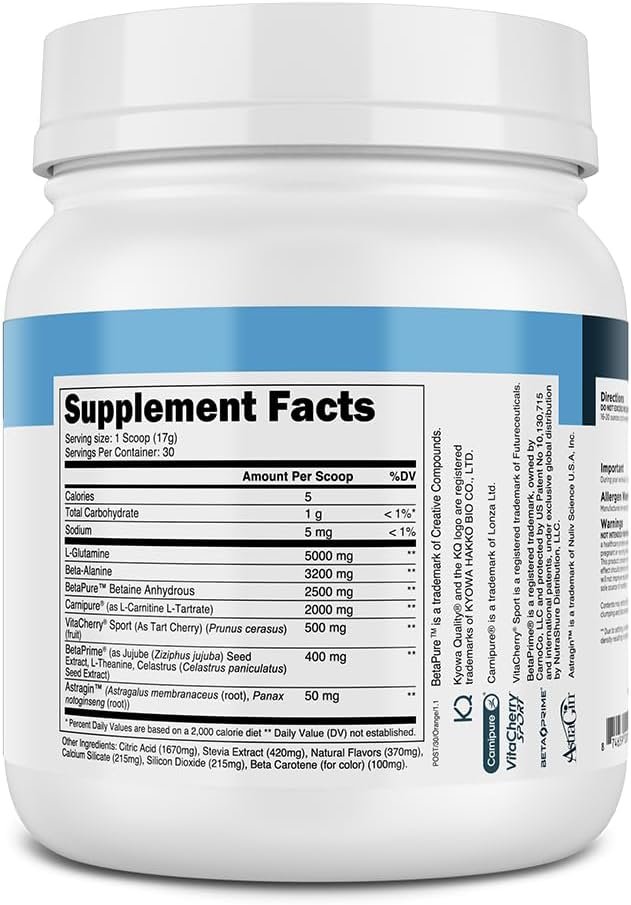 • L-Glutamine (5 g): A conditionally essential amino acid that supports muscle glycogen resynthesis, immune function, and digestive health.