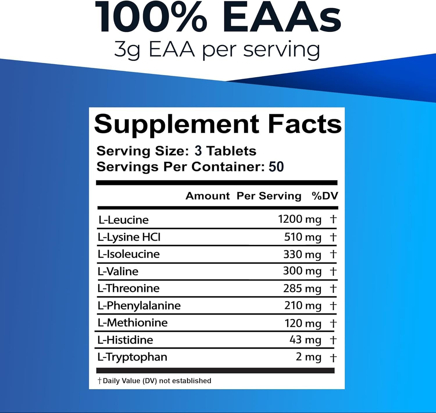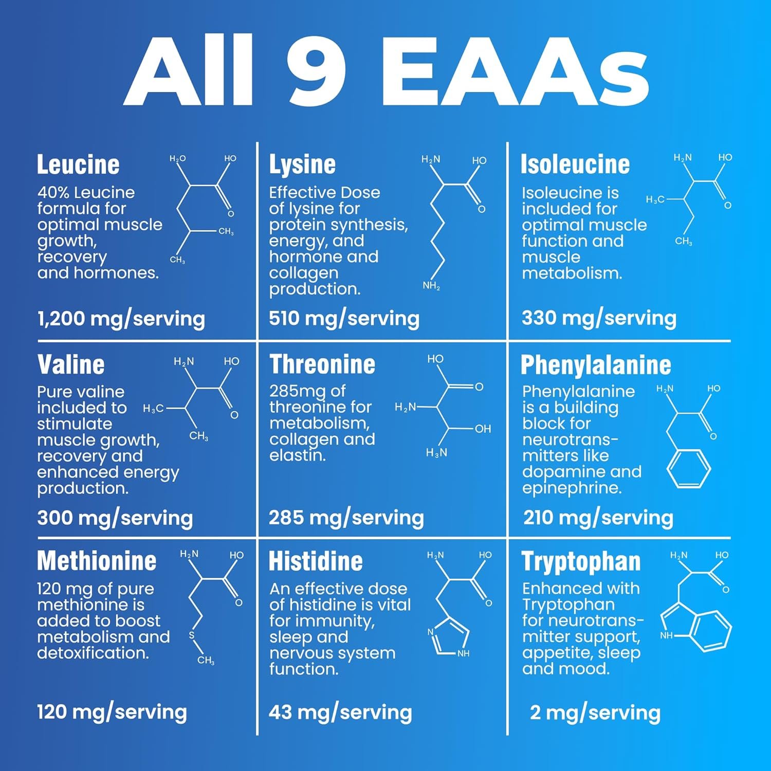 The nine EAAs — including leucine, isoleucine, valine, lysine, threonine, phenylalanine, methionine, tryptophan, and histidine — are the building blocks your body cannot produce on its own and must get from diet or supplementation. EAAs are crucial for protein synthesis, training recovery, muscle repair, and metabolic function.