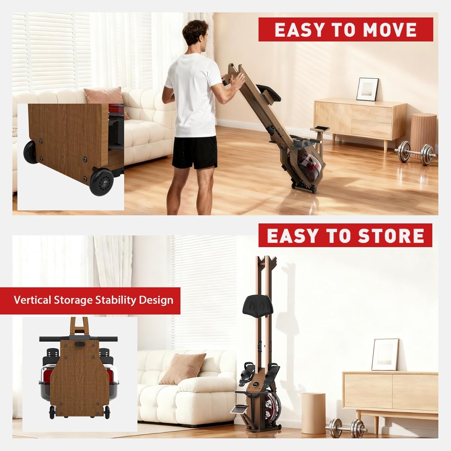 • The wood structure isn’t just for looks — it dampens noise and vibration, giving workouts a smoother, quieter feel than metal-only alternatives.