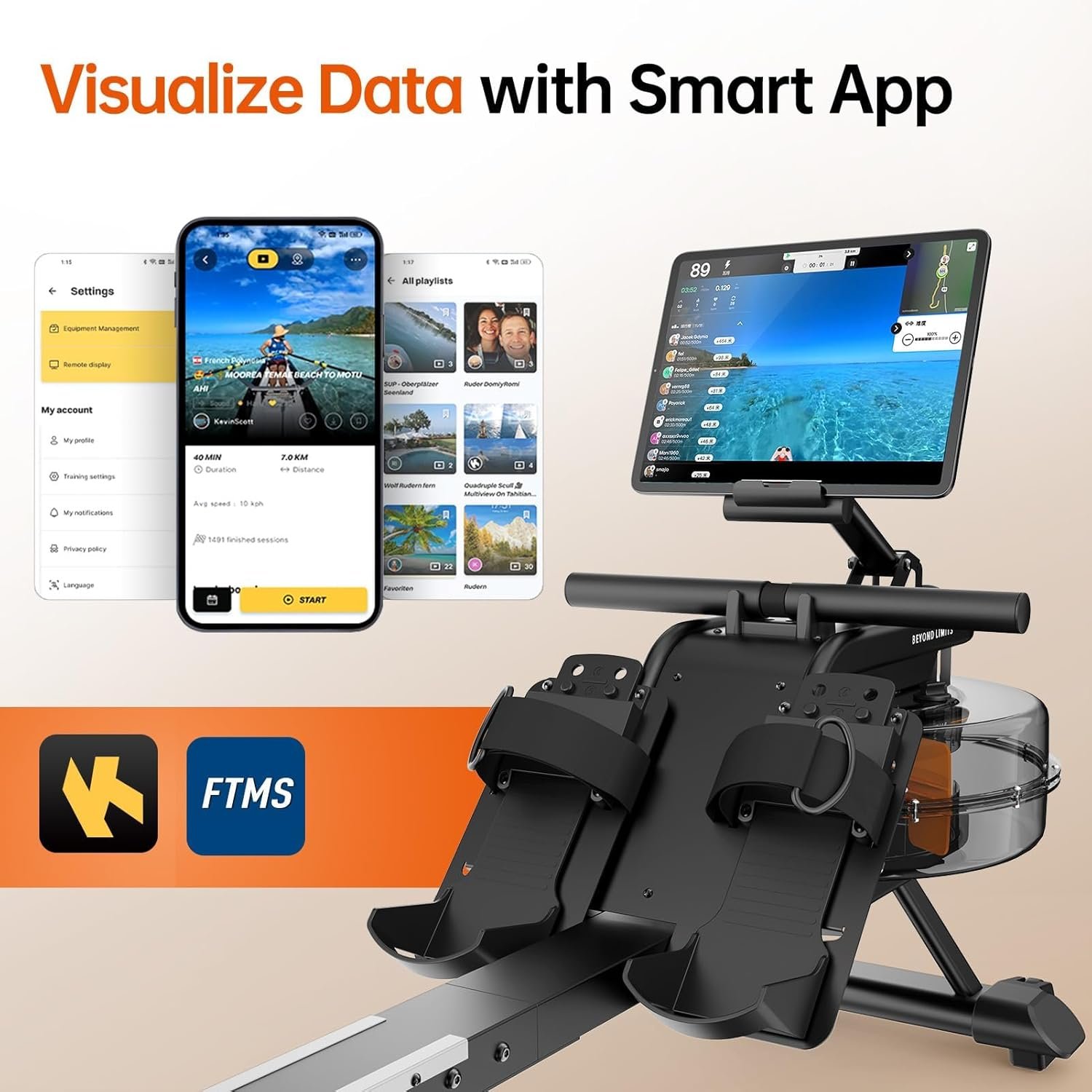 A built-in tablet/phone holder adds convenience for following workout videos, scenic rowing routes, or streaming content while you train.