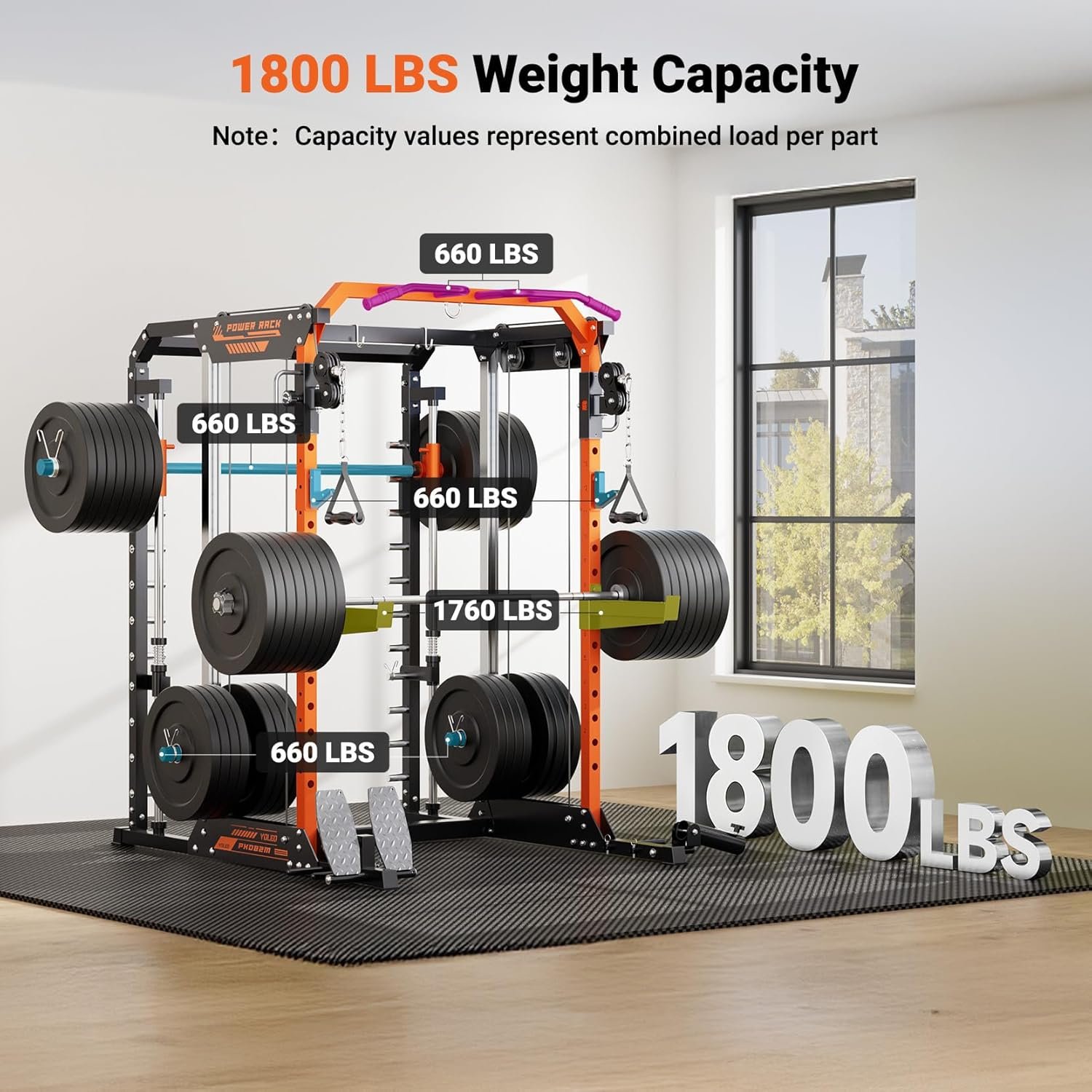 Built from heavy‑duty steel (2 mm thickness), with widened base plates and a hybrid system combining Smith‑machine bar with safety catches plus J‑hooks. Rated for up to ~1700 lb (or even higher in some updates) — making it suitable for advanced lifters.