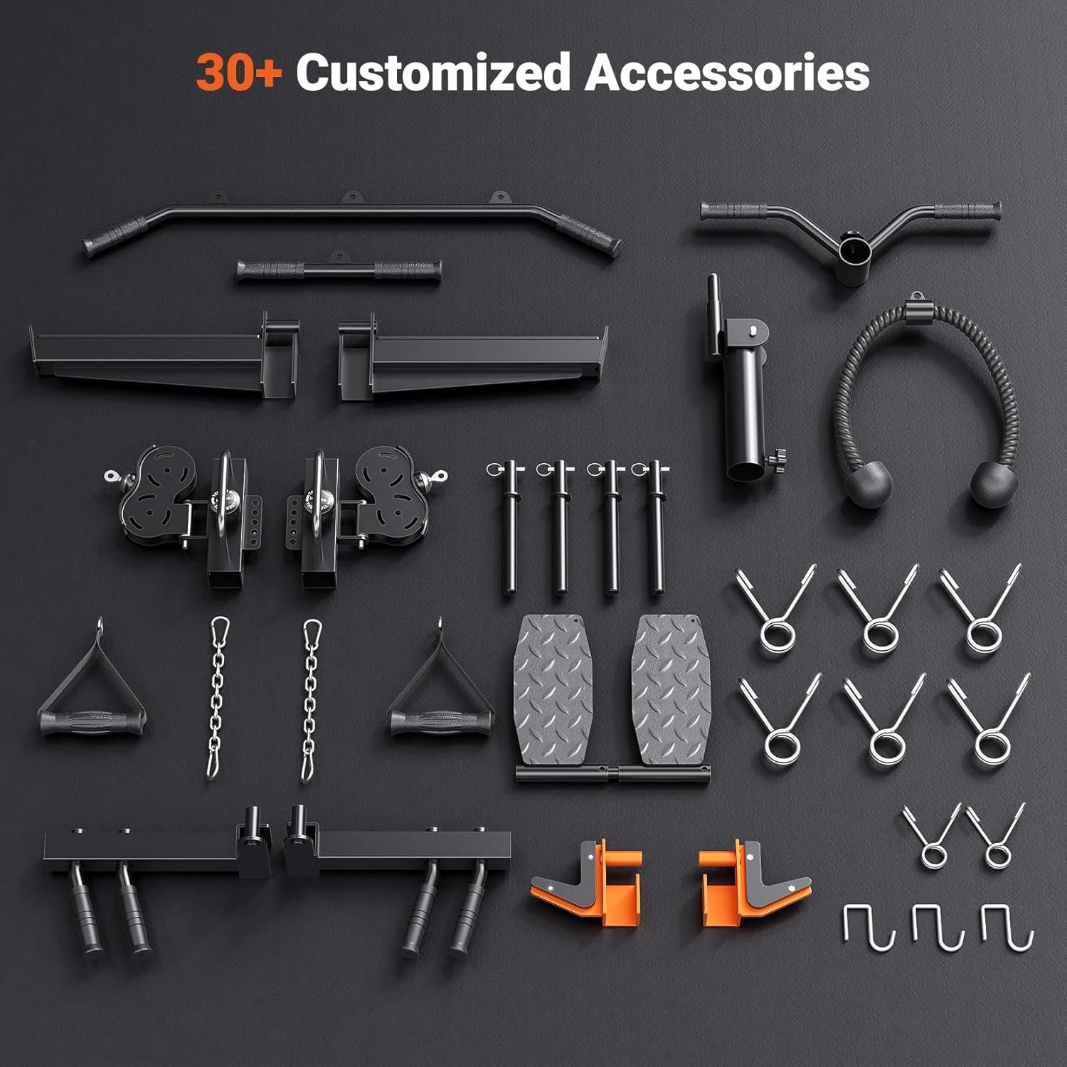 21 height adjustment holes accommodate a wide range of lifts (squats, bench press, incline press, etc). Includes an array of accessories: landmine tube (360° rotation), dip bar, lat‑pulldown bar, low‑row bar, T‑bar attachments and more.